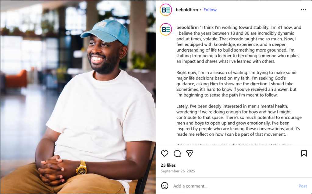 Strategically, the series strengthens BE BOLD’s commitment to meaningful communication. Bold Voices is not about spectacle; it is about resonance. It demonstrates how storytelling can build connection within Kigali’s creative and professional communities and beyond. By pairing thoughtful copy with compelling imagery, we transform everyday reflections into conversations that travel—across timelines, across communities, and across generations.